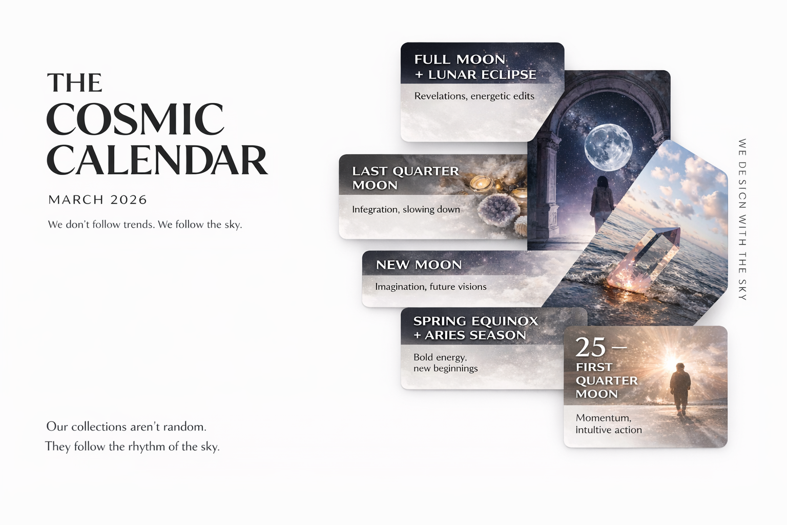 We add regular drops every week, timed to cosmic moments (new/full moons, seasonal shifts), plus surprise mini-drops for trending themes.